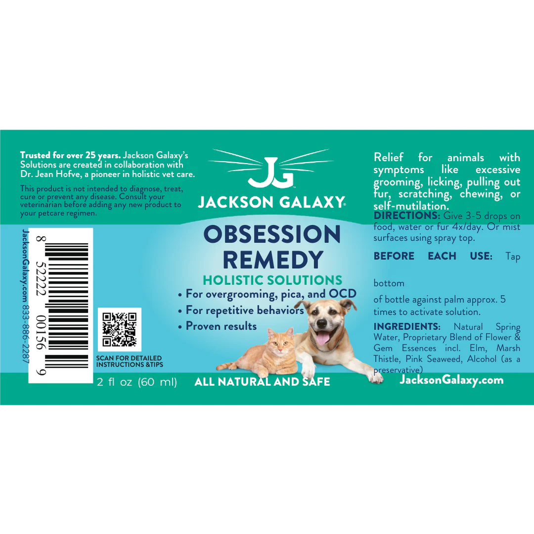 This solution is designed to help animals with obsessive-compulsive behaviors such as excessive grooming, pica, licking, pulling out fur, excessive scratching and chewing, or self-mutilation. Along with stress reducing activities and oftentimes pharmaceutical assistance, Obsession Remedy helps “break the chain.”