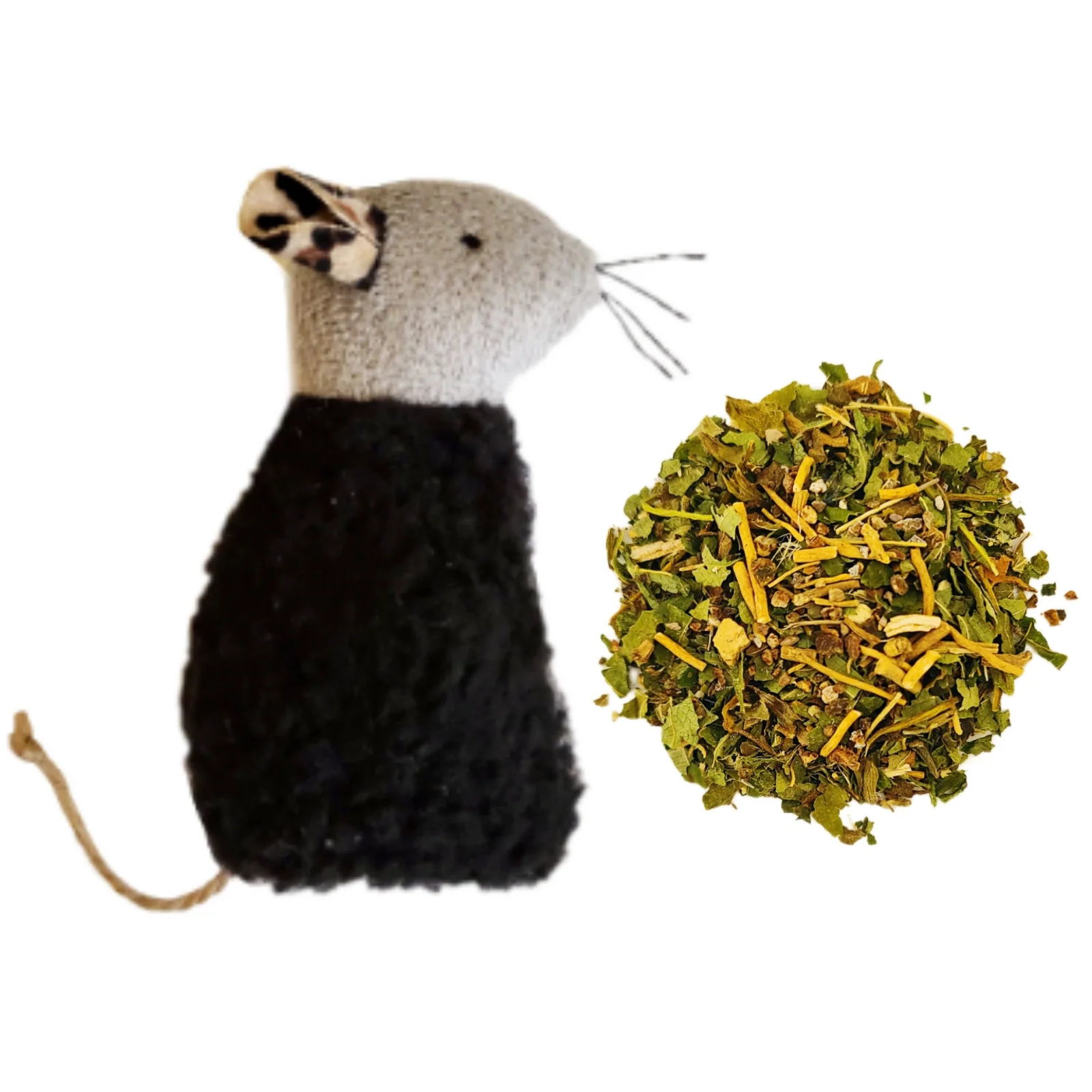 The black mouse toy is stuffed with Space Kitty Express' proprietary blend of 4 catnip alternatives: Silver Vine Fruit and Leaves, Organic Valerian Root, Organic Lemon Balm, and Tatarian Honeysuckle.